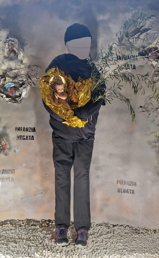 Ma che cosa può fare ognuno di noi di fronte a quest’infanzia negata? A questa riflessione vuole spingere la figura umana collocata al centro della scena: in braccio porta Gesù bambino – che con la sua nascita continua a portare una promessa di speranza e di vita – e al posto del volto ha uno specchio, così che ogni persona che si avvicina possa riconoscersi.